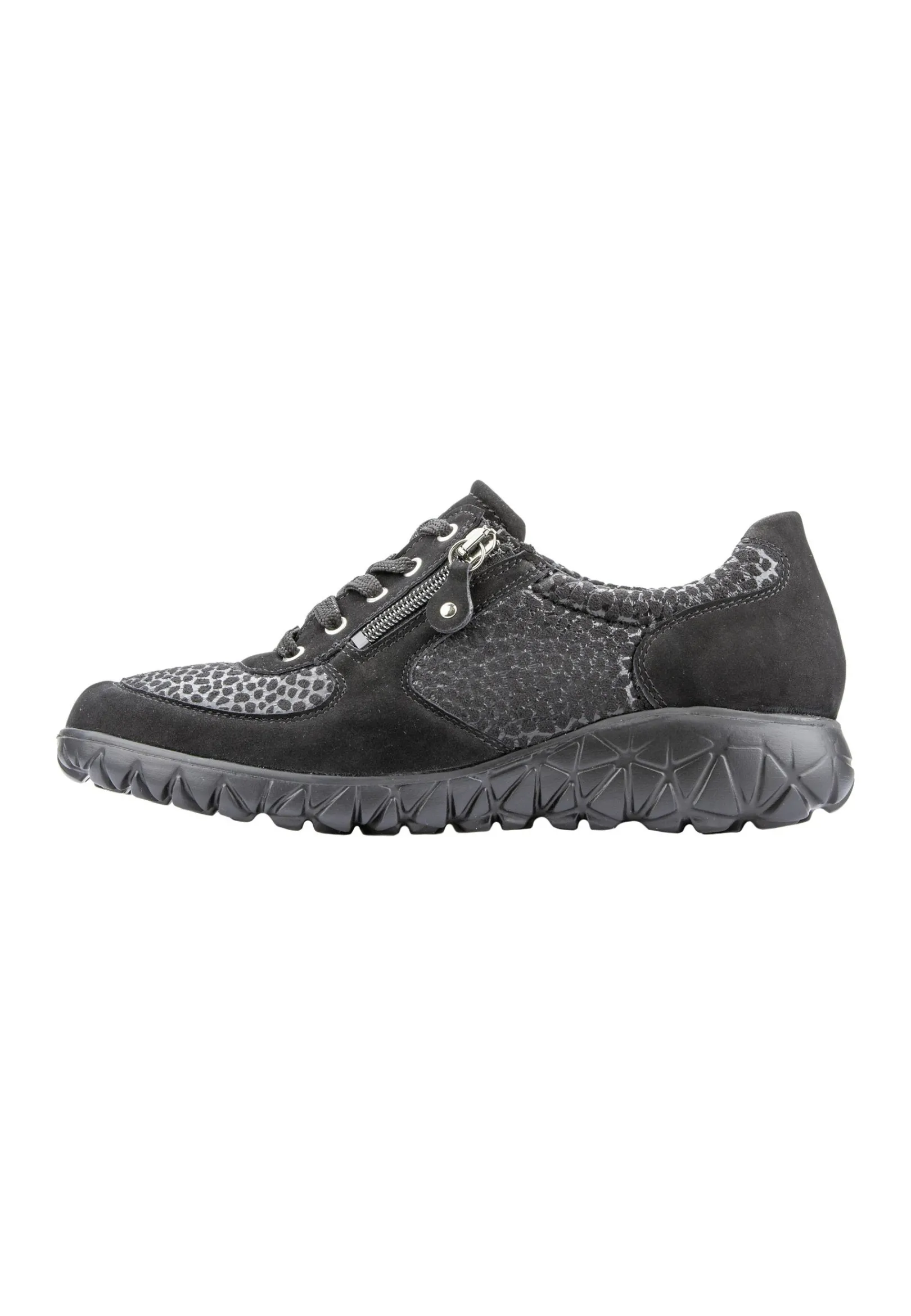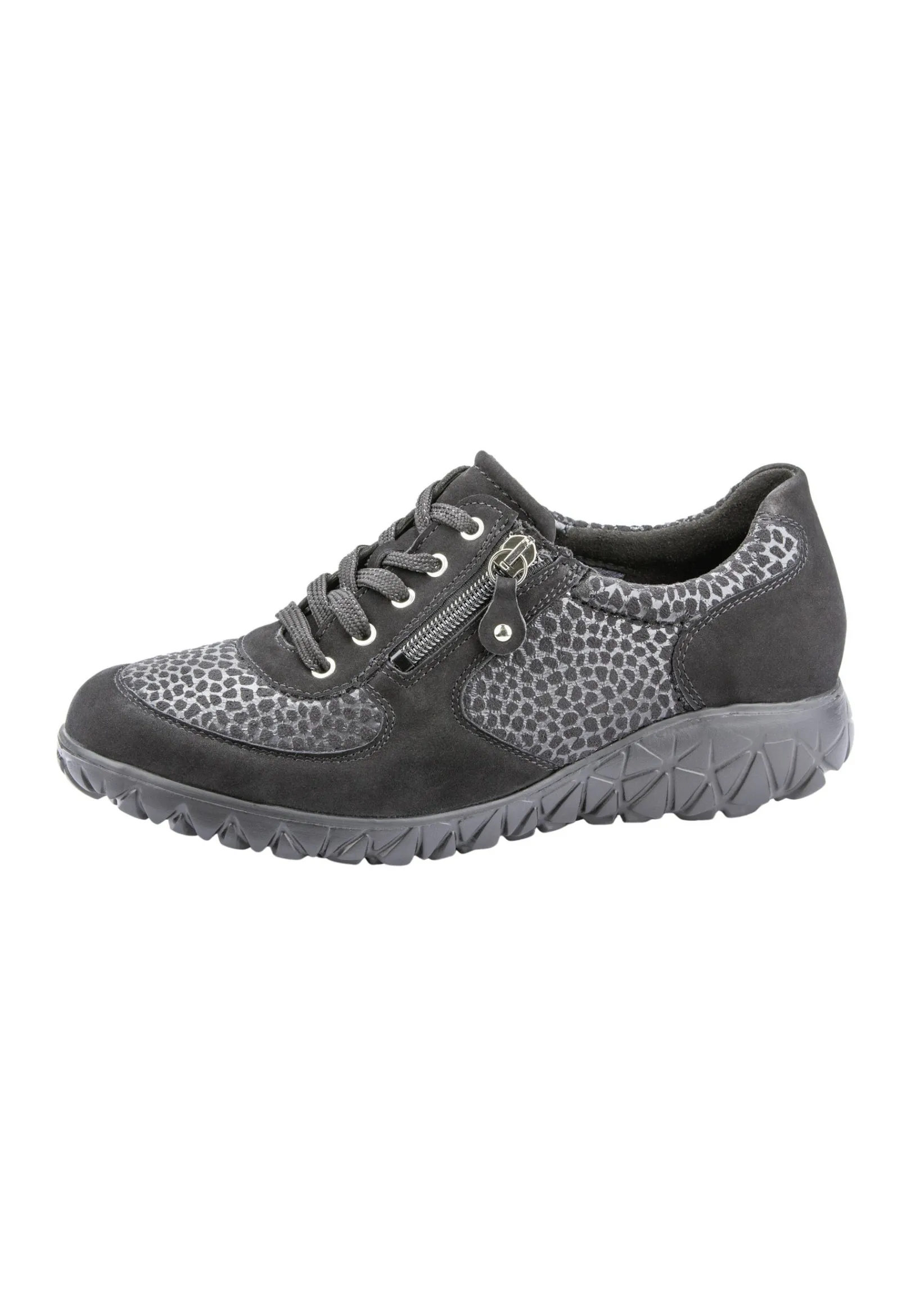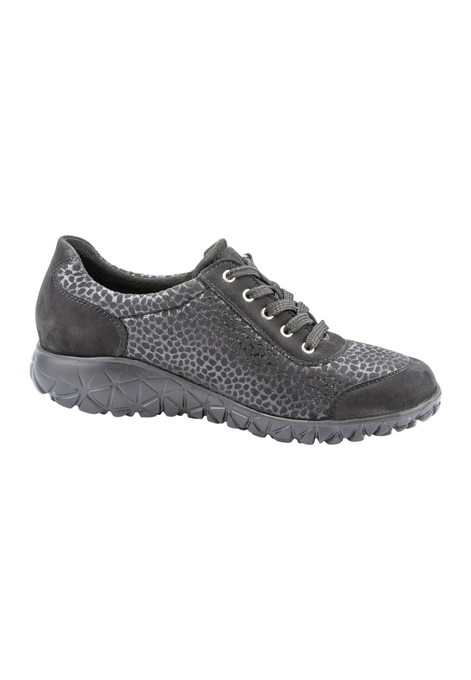 Der Klassisch Schwarze Havy-Soft Wird Mit Seinem Dezenten Animalprint Zum Hingucker. Dabei Sieht Der Sneaker Nicht Nur Gut Aus, Er Bietet Auch Hohen Komfort. Die Dämpfende Eva-Sohle Gibt Mit Ihrem Besonderen Profil Guten Halt Und Sorgt Mit 20 Mm Sprengung Zugleich Für Einen Hohen Tragekomfort. Der Seitliche Reißverschluss Ist Nicht Nur Eine Schöne Verzierung, Sondern Erleichtert Auch Das An- Und Ausziehen. In Kombination Mit Der Praktischen Schnürung Und Dem Anschmiegsamen Material Kann Nichts Drücken. So Ist Der Havy-Soft Aus Der Orthotritt-Kollektion Der Perfekte Begleiter Für Sensible Füße.