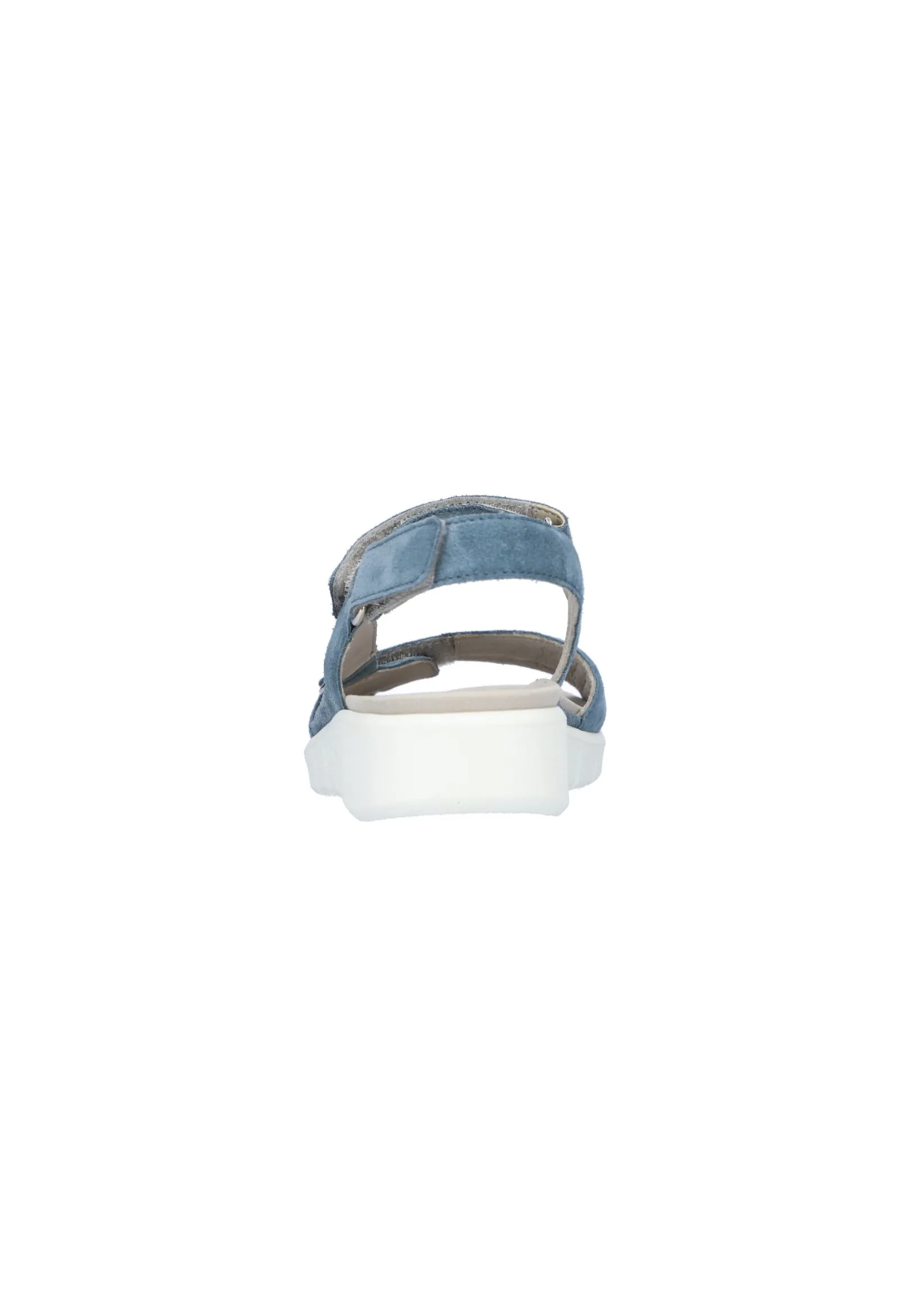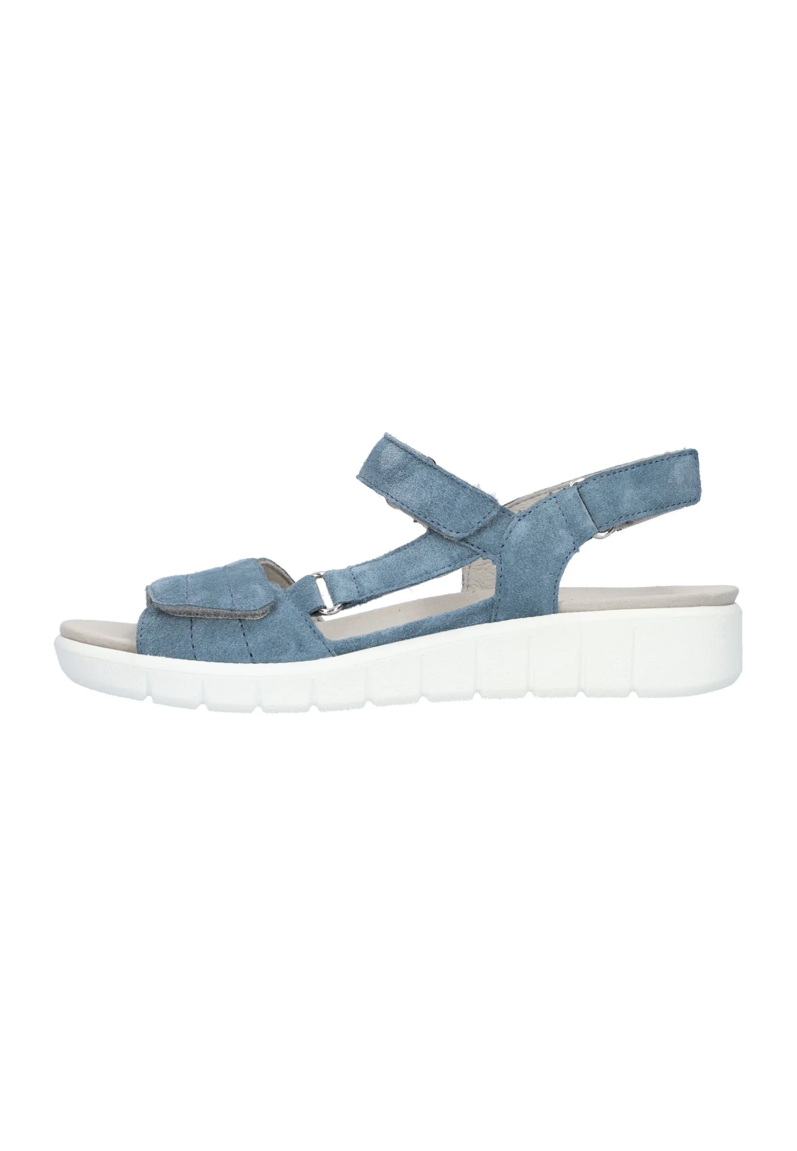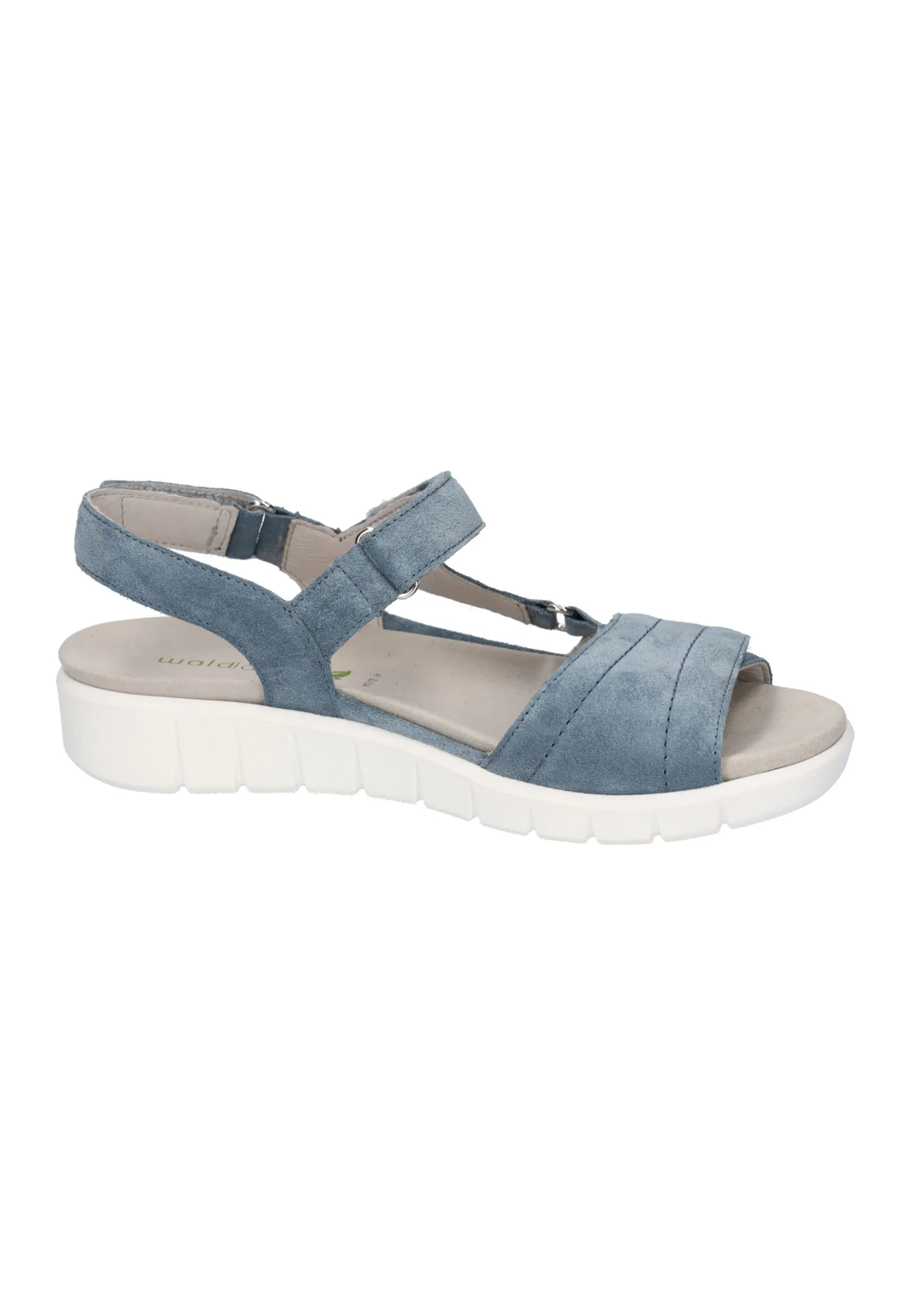 Entdecken Sie Die Waldläufer H-Lotta Sandale In Einem Frischen Blau-Denim. Hergestellt Aus Veloursleder, Bietet Diese Sandale Sowohl Stil Als Auch Langlebigkeit. Das Futter Aus Leder Sorgt Für Ein Angenehmes Tragegefühl, Während Die Großzügige H-Weite Eine Bequeme Passform Gewährleistet. Mit Einem Klettverschluss Ausgestattet, Ermöglicht Diese Sandale Eine Individuelle Anpassung. Die Strapazierfähige Pu-Sohle Bietet Optimalen Halt Und Komfort. Perfekt Für Warme Tage Und Lässige Ausflüge.
