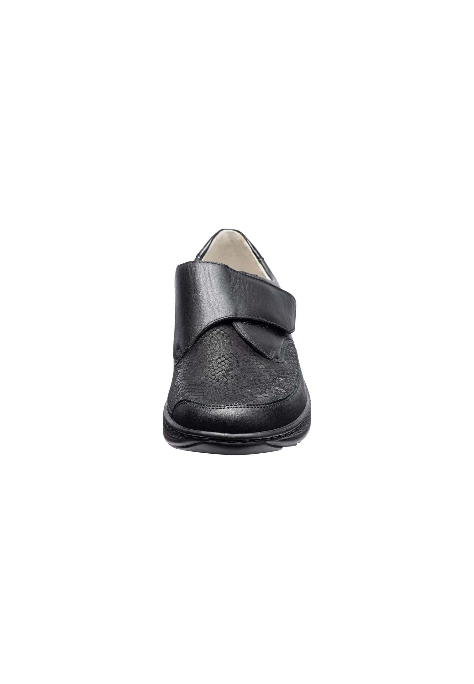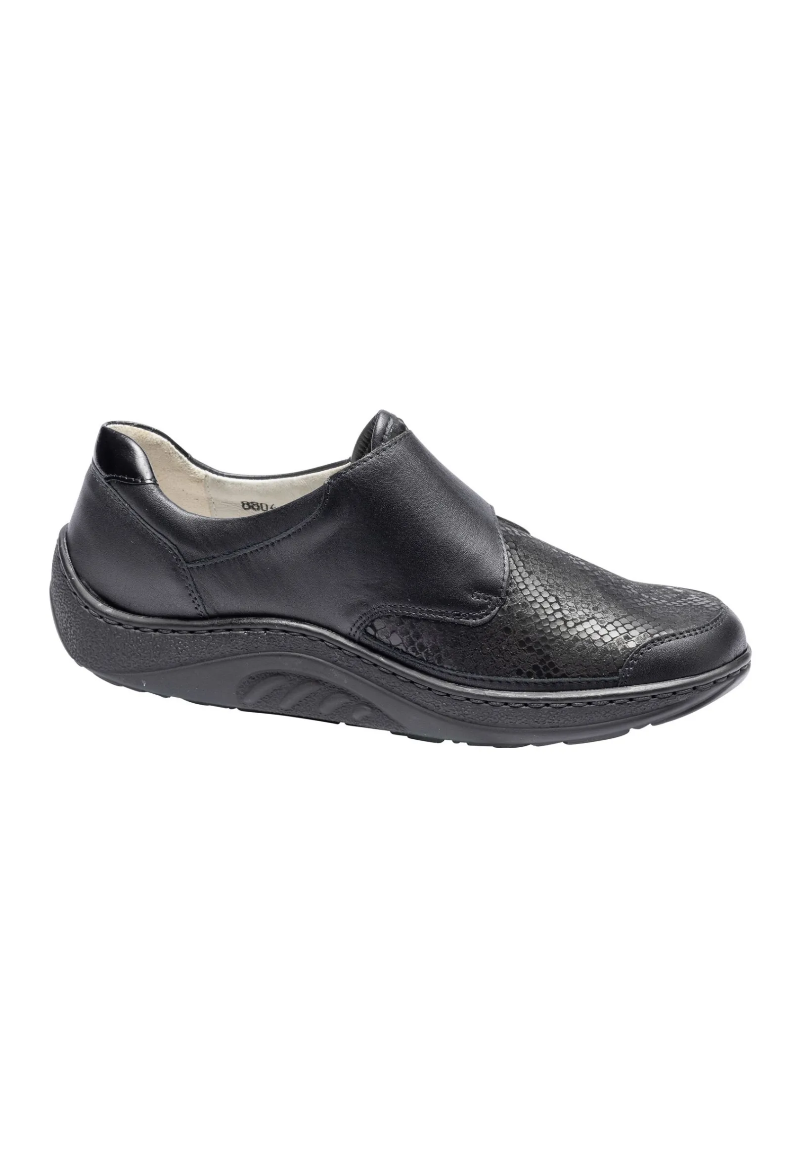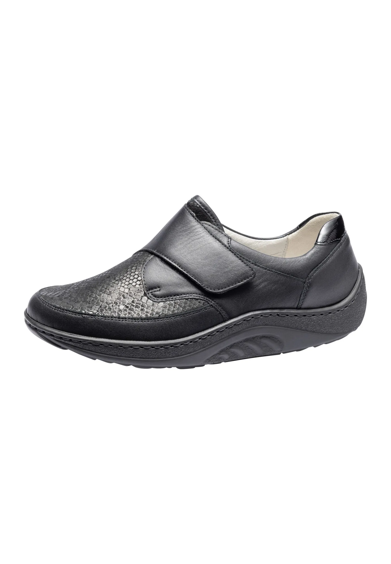 Dieses Orthotritt-Dynamic Modell In Schwarz Ist Ein Bequemer Begleiter Für Den Alltag. Dasmodische Schlangenmuster An Der Schuhspitze Ist Ein Dezenter Blickfang. Dasobermaterial Ist Aus Weichem Nappaleder Gefertigt. Durch Den Großenklettverschluss Wird Der Ein- Und Ausstieg Erleichtert Und Die Weite Schnell Angepasst. Wie Alleorthotritt-Modelle Von Waldläufer Ist Auch Dieser Schuh In Seinem Obermaterialflexibel, Schmiegt Sich Der Einmaligen Fußform An Und Ist Daher Gerade Fürsensible Füße Besonders Gut Geeignet. Dazu Kommt Seine Angenehme H-Weite Unddie Abroll-Luftpolstersohle (Pu), Die Beim Gehen Fußschonend Wirkt.