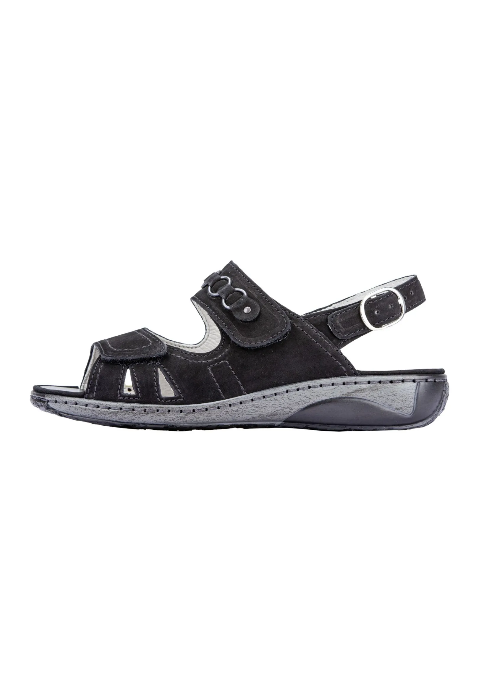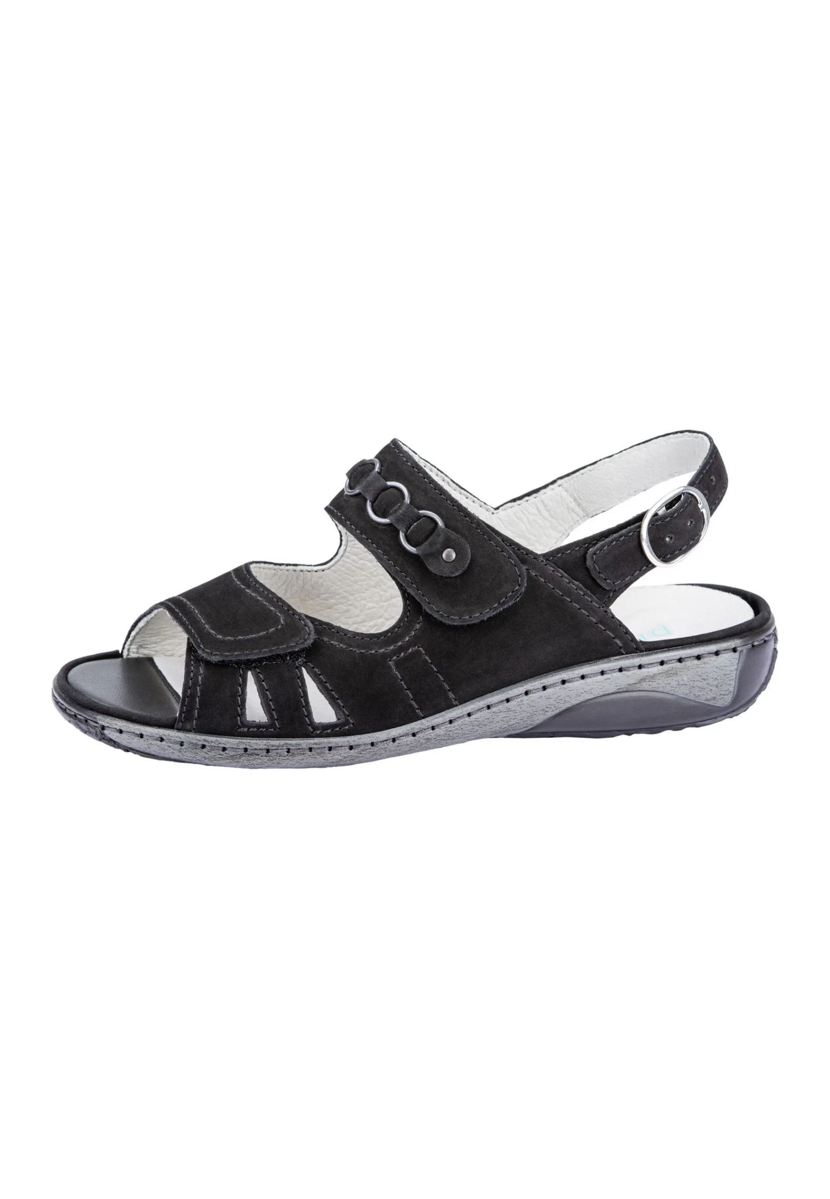 Eleganz Und Bequemlichkeit Sind In Diesem Modell Vereint. Das Hochwertige Leder Macht Die Damen Sandale Garda In Der Farbe Schwarz Besonders Chic. Der Schuh Lässt Sich Mit Den Klettverschlüssen Individuell An Den Fuß Anpassen. Für Optimalen Halt Und Höchsten Tragekomfort Sorgen Zudem Das Gepolsterte Wechselfußbett Und Die Schmale Ferse Sowie Die Weite G Für Den Normalen Fuß.