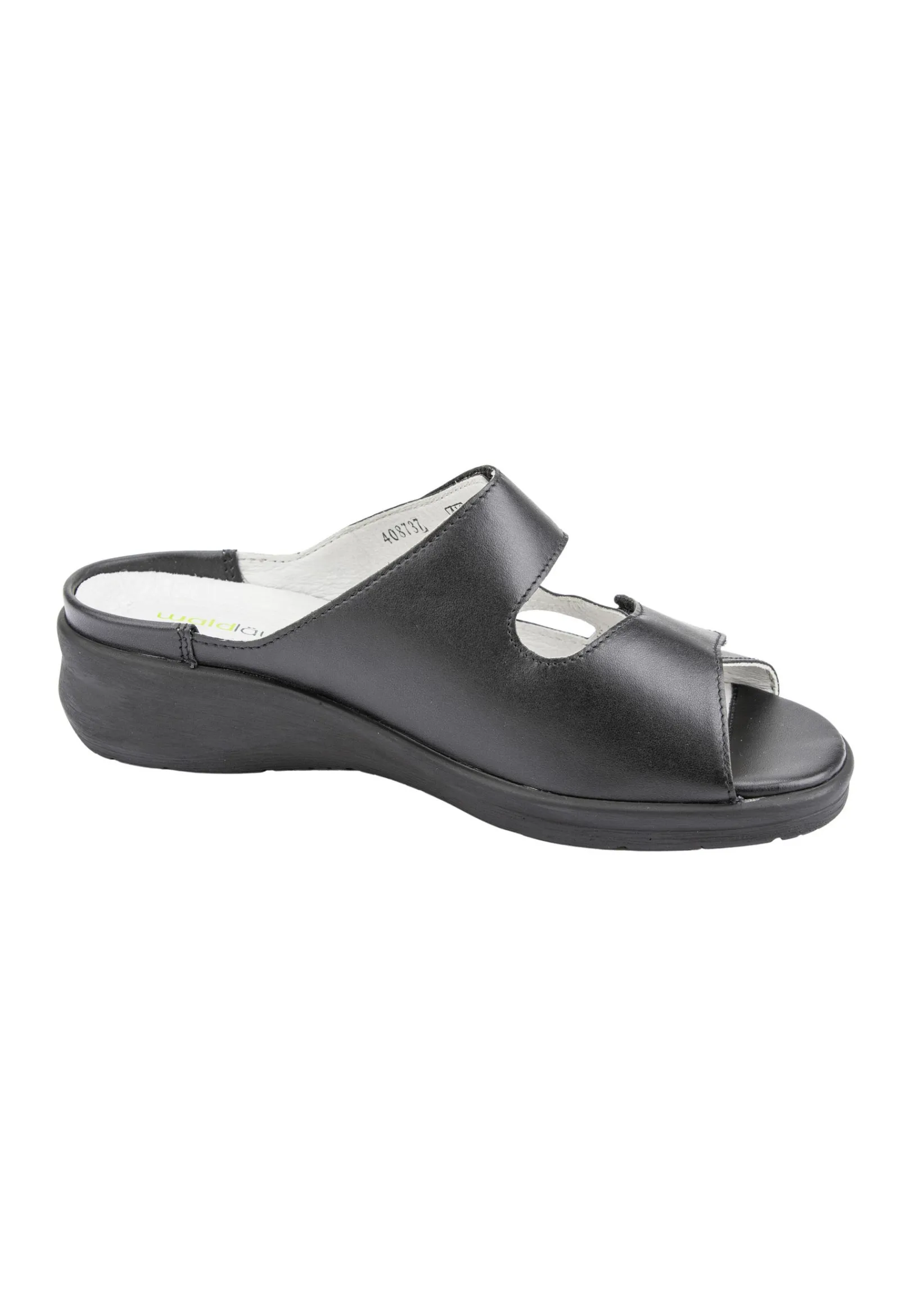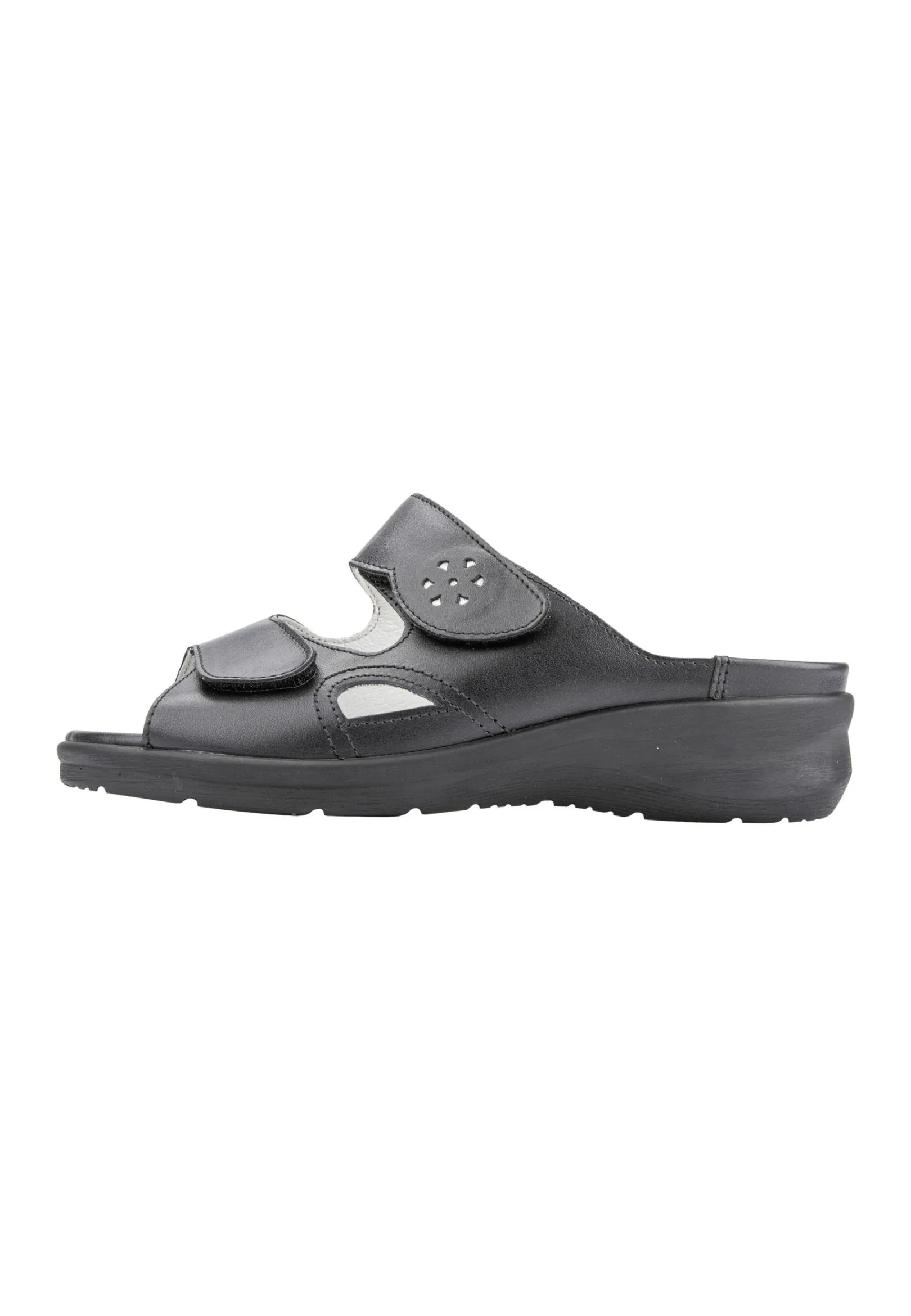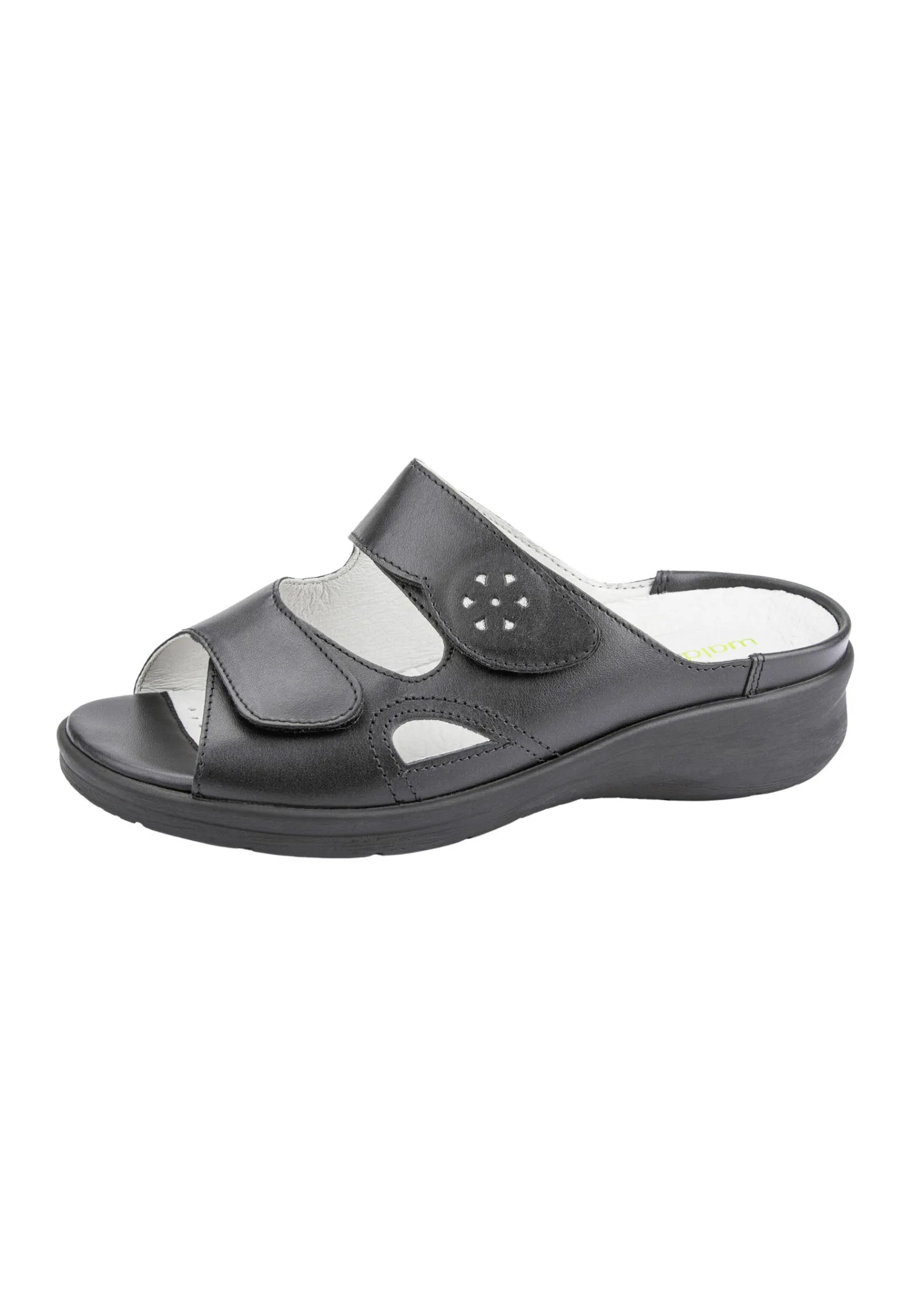 Sommerlich-Luftig Und Elegant-Verspielt Gibt Sich Die Pantolette Merle In Schwarzem Nappaleder Mit Dezenter Lochblüte. Sie Zeigt Einmal Mehr, Wie Modisch Ein Waldläufer In Der Weite M Für Den Besonders Kräftigen Fuß Sein Kann. Die Sandale Punktet Außerdem Mit Ihrem Wechselfußbett, Der Hochwertigen Verarbeitung Und Dem 3 Cm Hohen Absatz, Der Den Femininen Look Unterstreicht. Praktisch: Die Individuell Verstellbaren Doppelklettverschlüsse Für Die Optimale Passform.