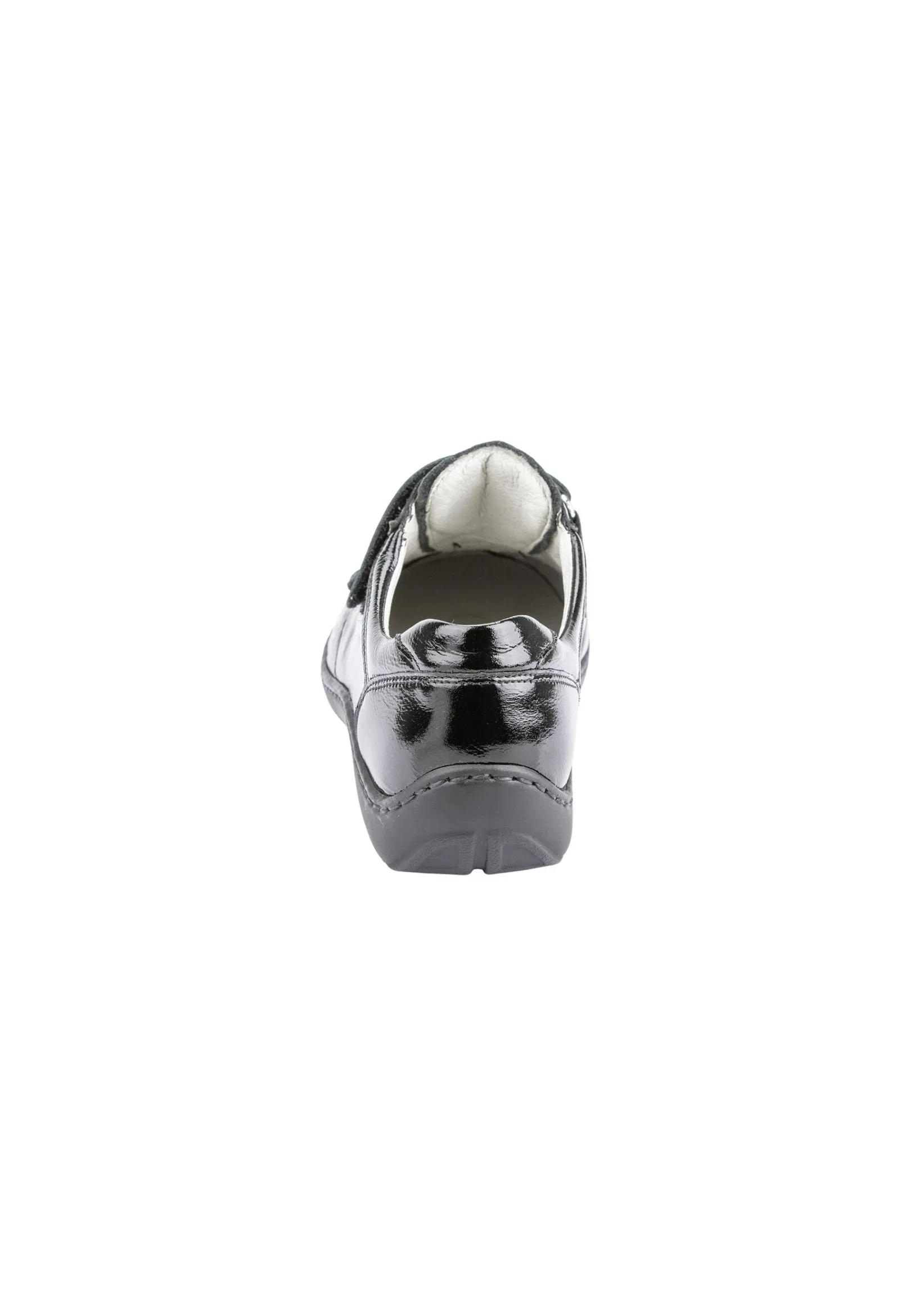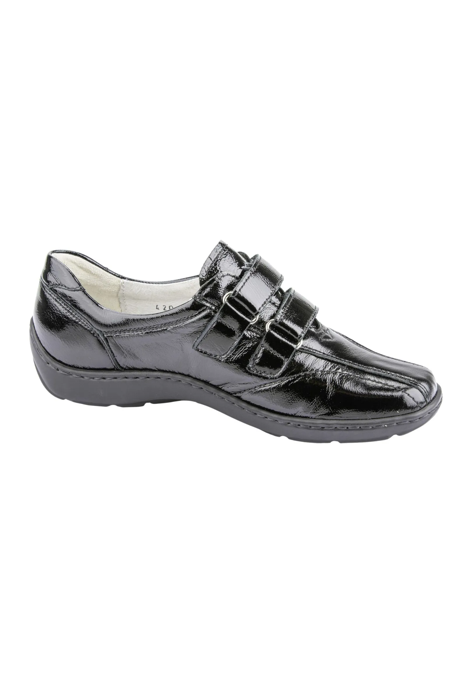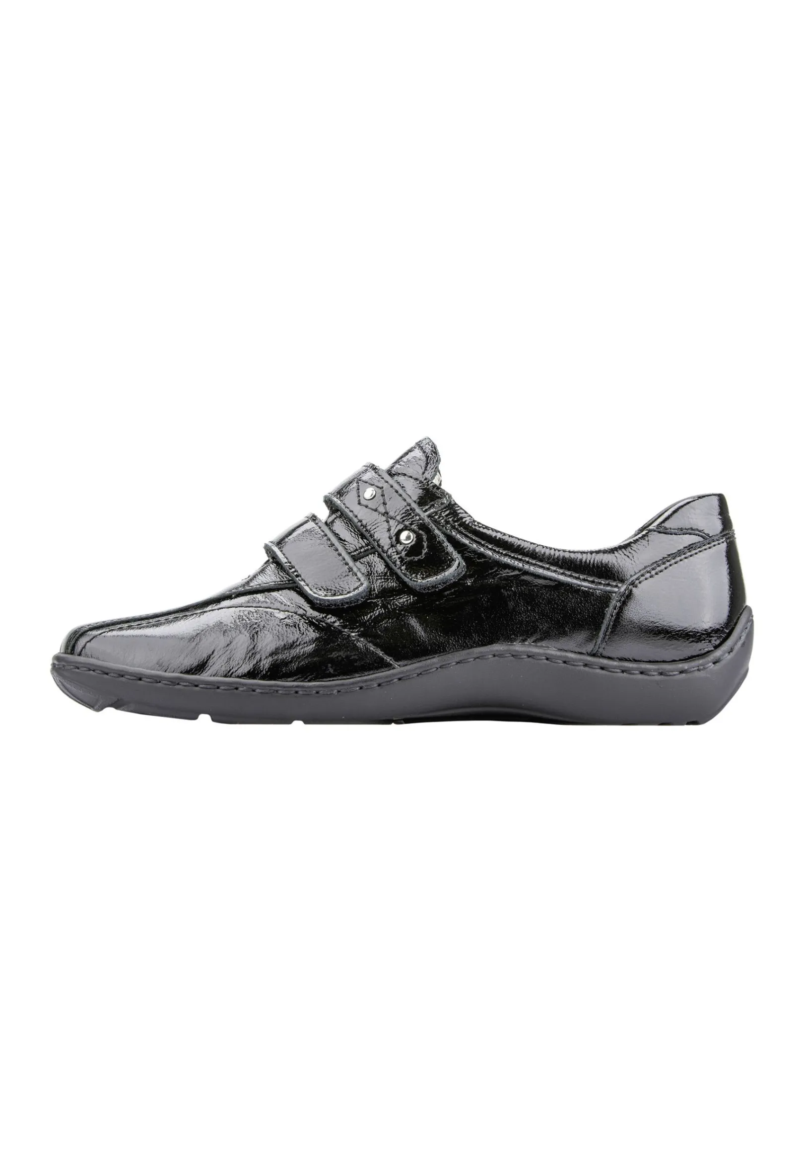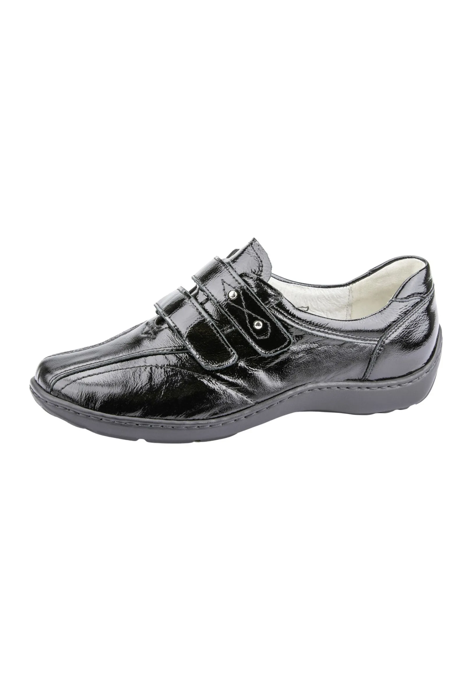 Der Damen Halbschuh Henni In Schwarzem Knautschlack Bietet Eine Perfekte Kombination Von Komfort Und Ansprechender Optik. Mit Dem Funktionellen Doppelklettverschluss Fürs Möglichst Bequeme An- Und Ausziehen Ist Das Modell Ideal Für Sensible Füße Geeignet. Auch Das Laufen Gestaltet Sich Mit Der Leichten Pu-Sohle Besonders Angenehm. Zum Optischen Hingucker Wird Der Schuh Mit Den Verspielten Ziernähten Und Kleinen Applikationen.