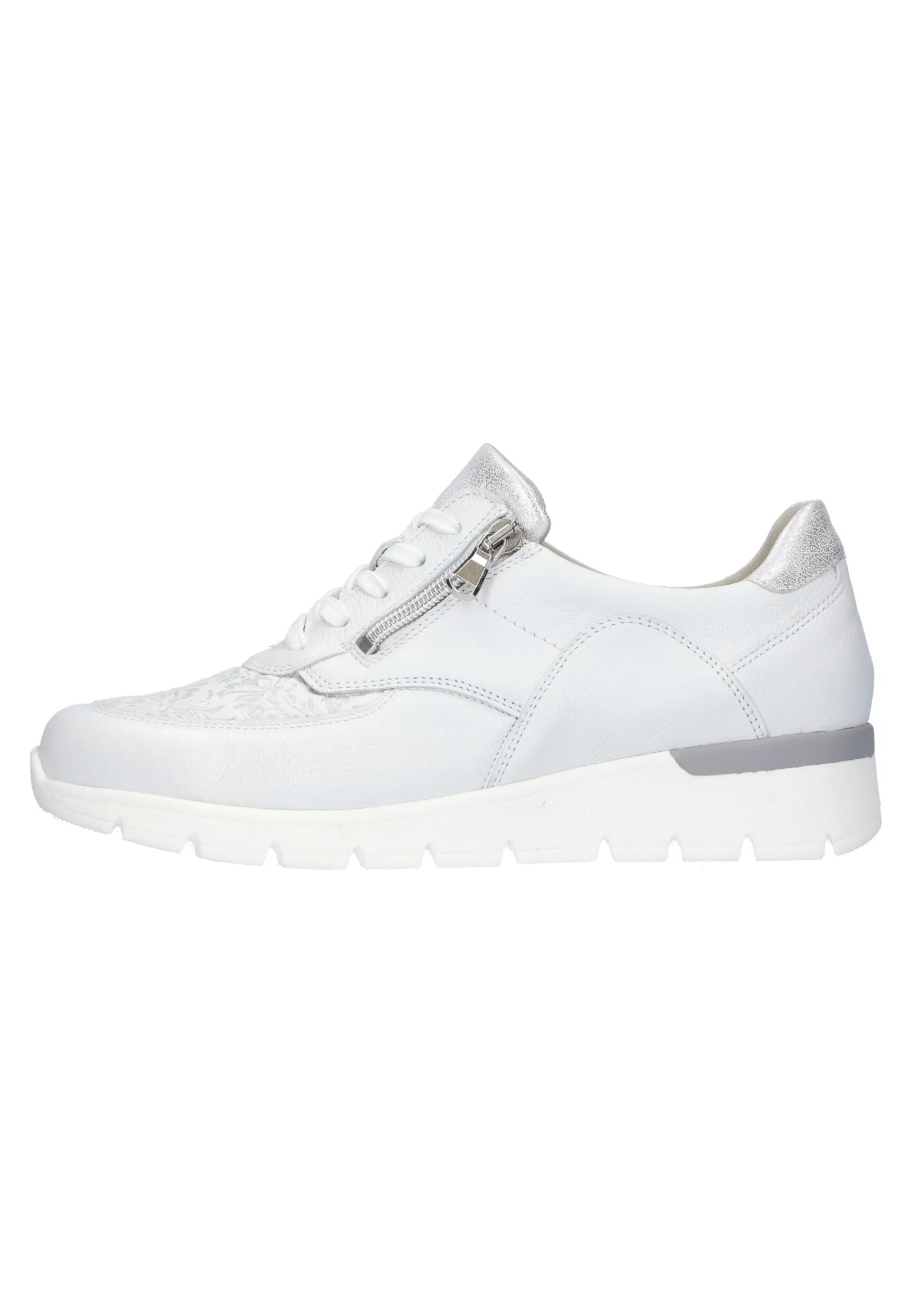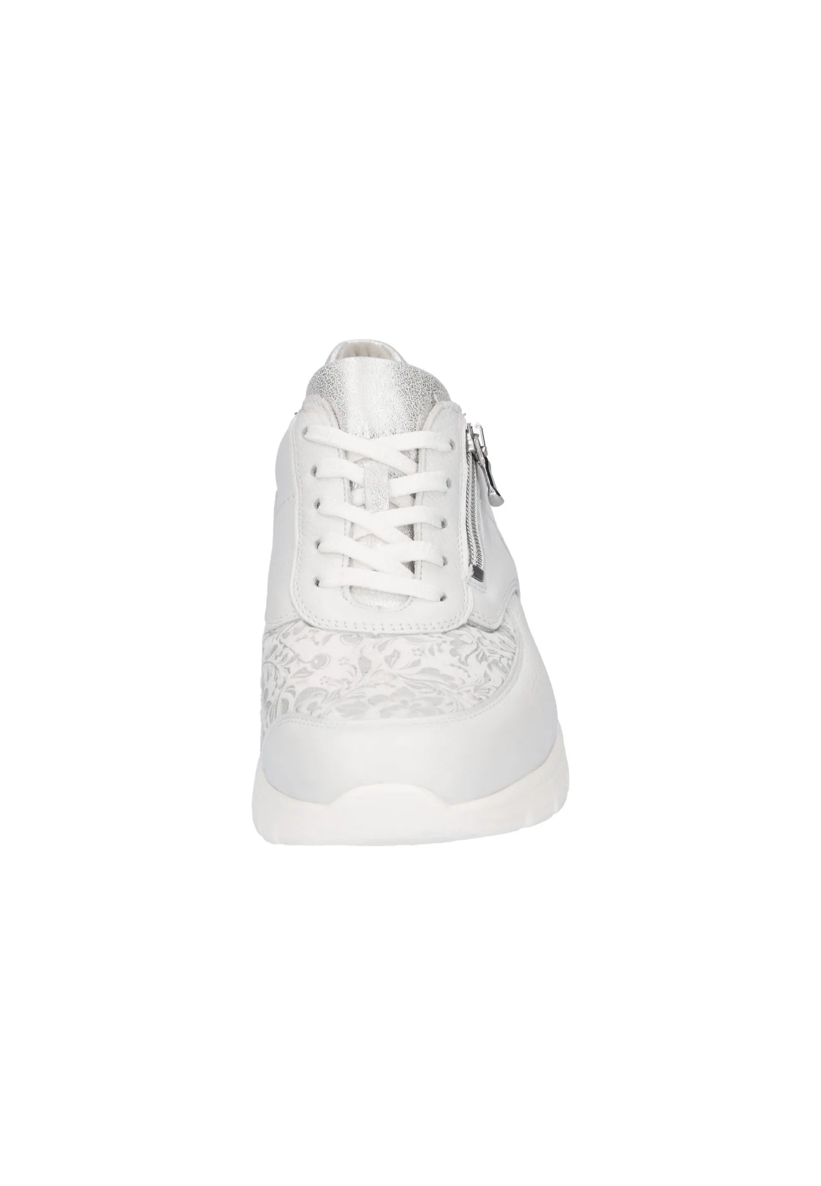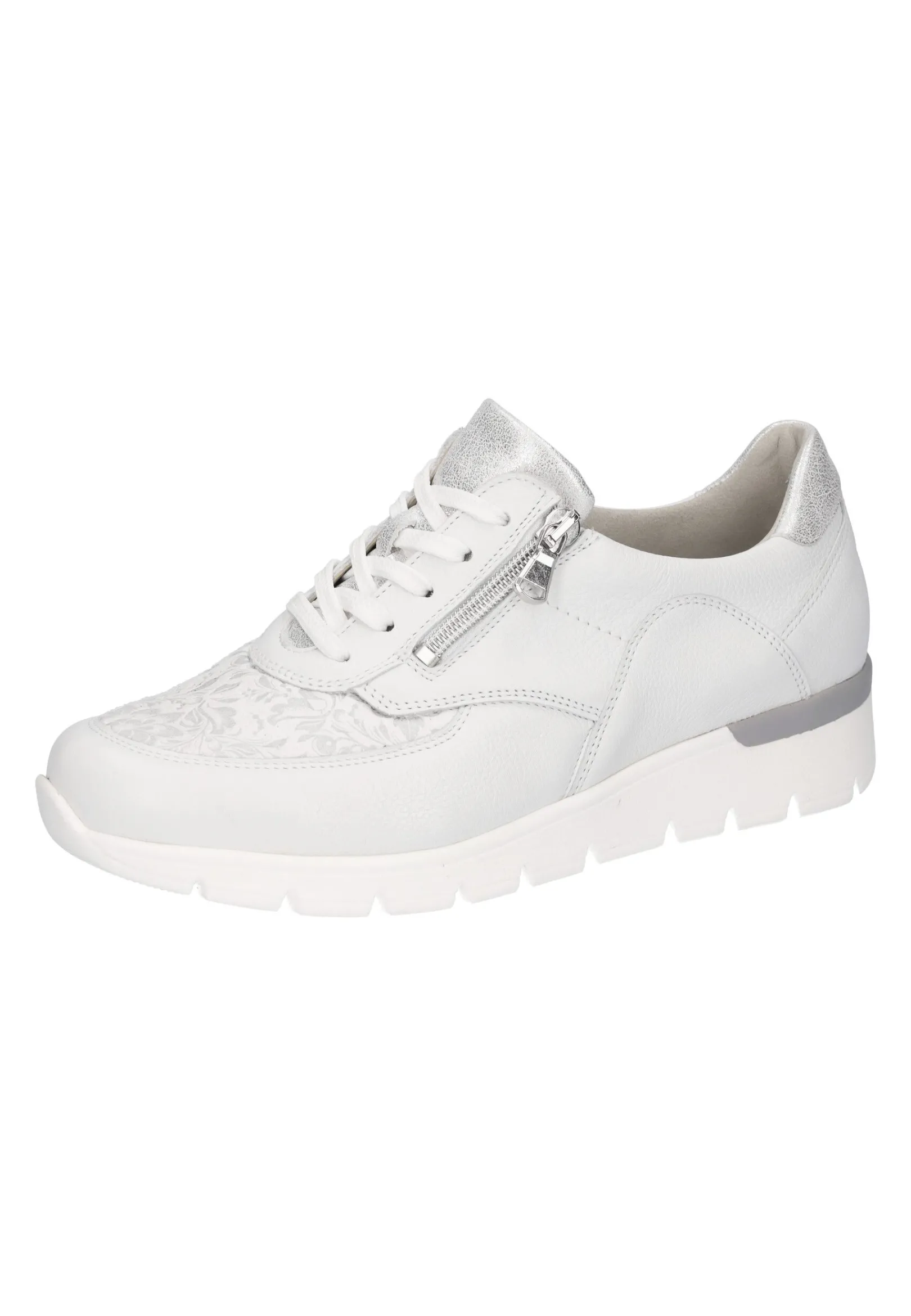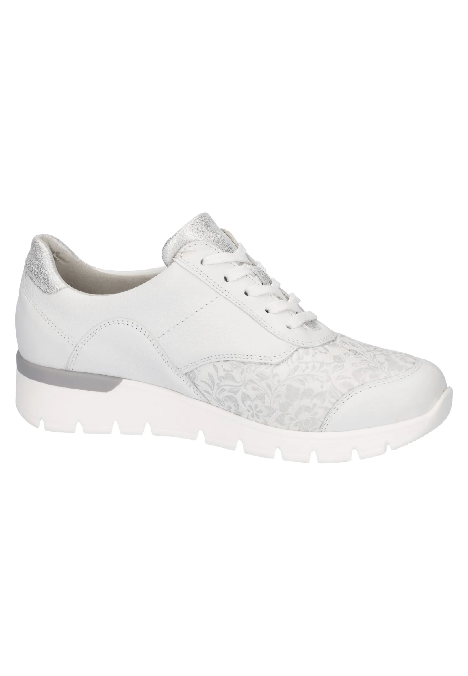 Der K-Ramona-Soft Damen-Sneaker Besticht Durch Seine Eleganz Und Bequemlichkeit. Der Zarte Farbton In Weiß Harmoniert Perfekt Mit Der Weißen Sohle, Während Der Schimmernde Blumendruck An Der Vorderseite Und Die Dezenten Farbakzente In Silber An Der Ferse Und Zunge Ein Paar Schöne Eyecatcher Bilden. Auch Der Zusätzliche Seitliche Reißverschluss Ist Ein Schöner Hingucker Und Dient Dem Vereinfachten An- Und Ausziehen. Die Leichte Sohle Bietet Guten Halt Und Sorgt Für Ein Angenehmes Gehen. Unterstützt Wird Dies Noch Durch Den 20 Mm Absatz. Dank Des Angenehmen Obermaterials Kann Bei Diesem Orthotritt-Sneaker Auch Nichts Drücken Oder Scheuern.