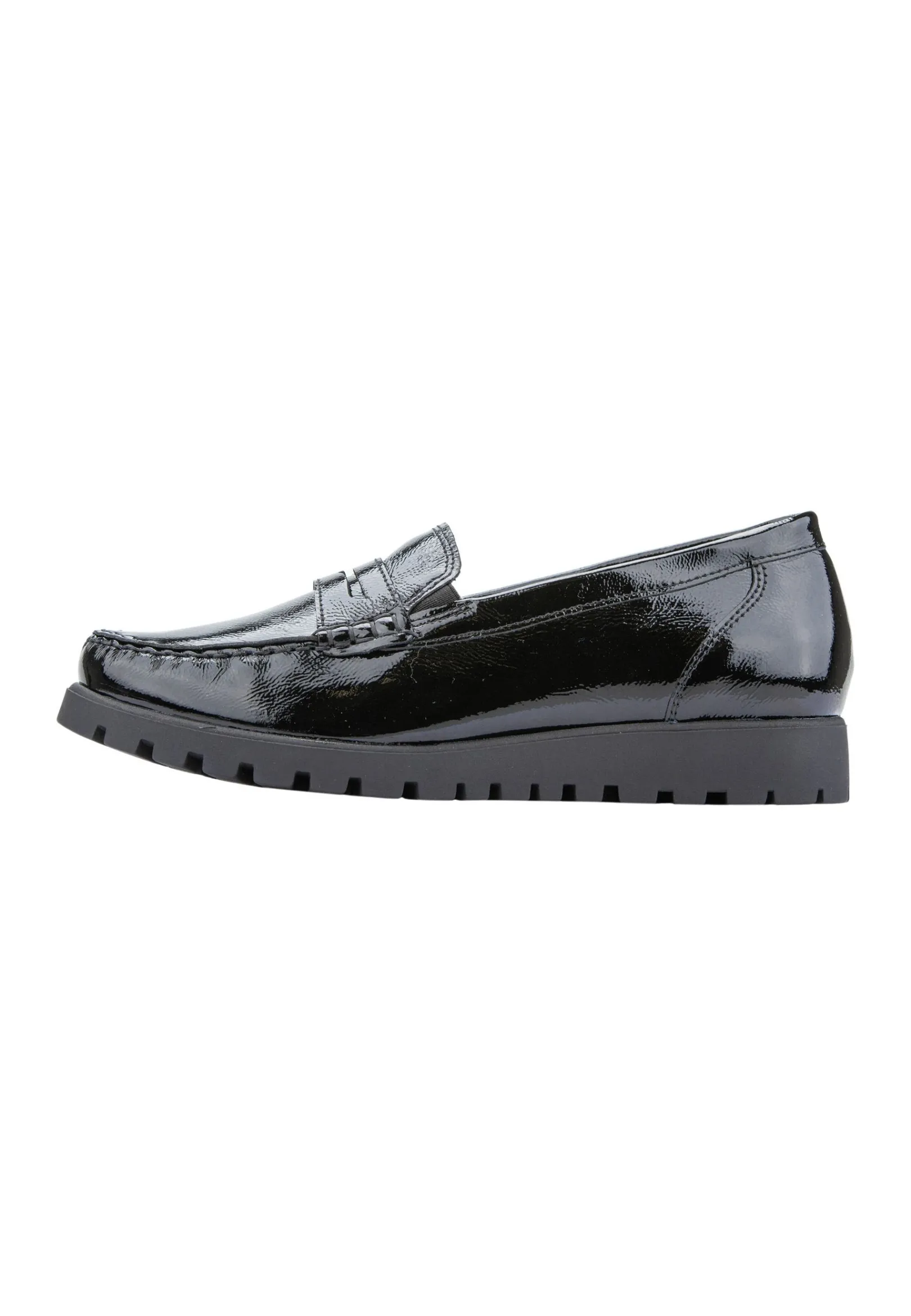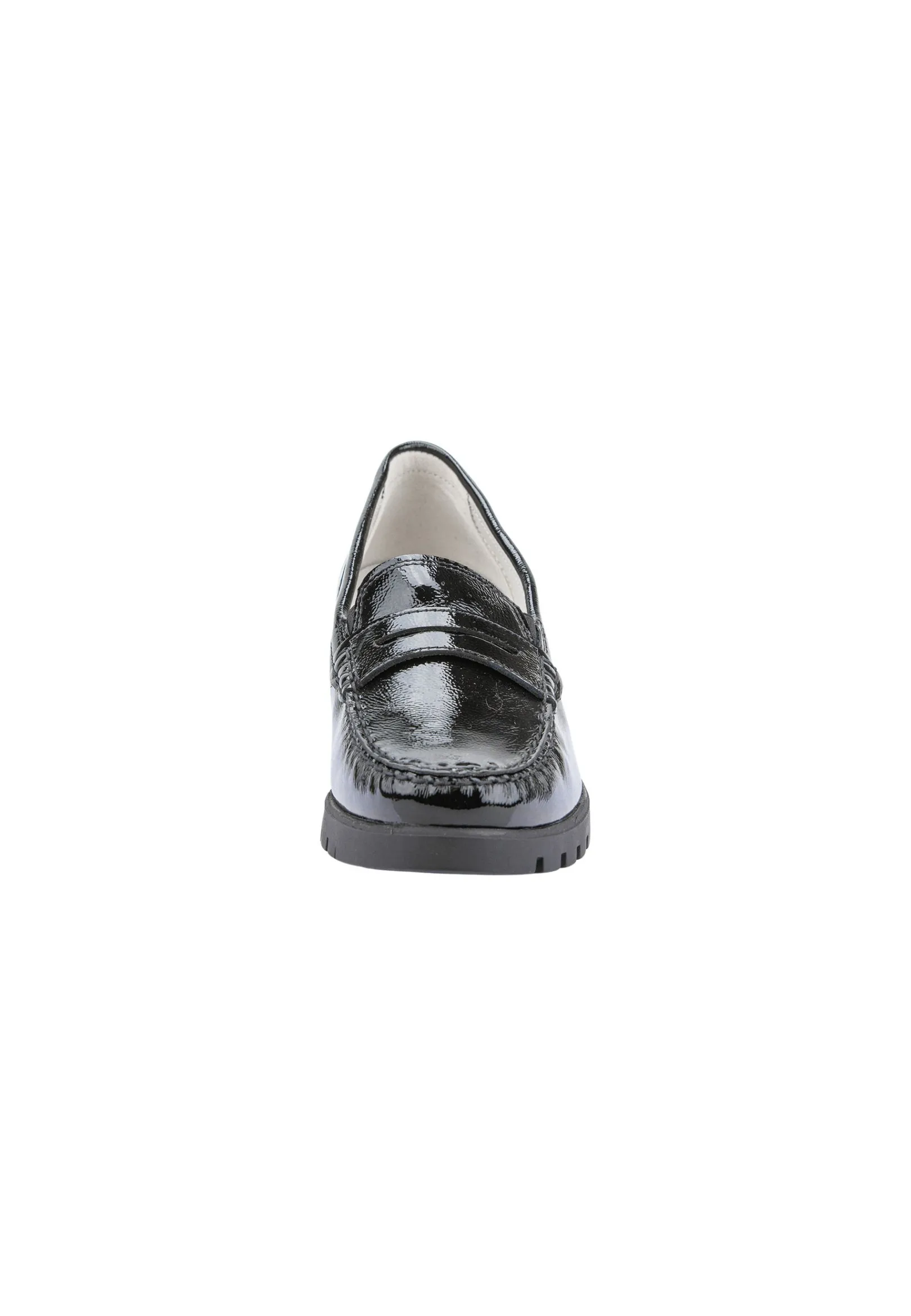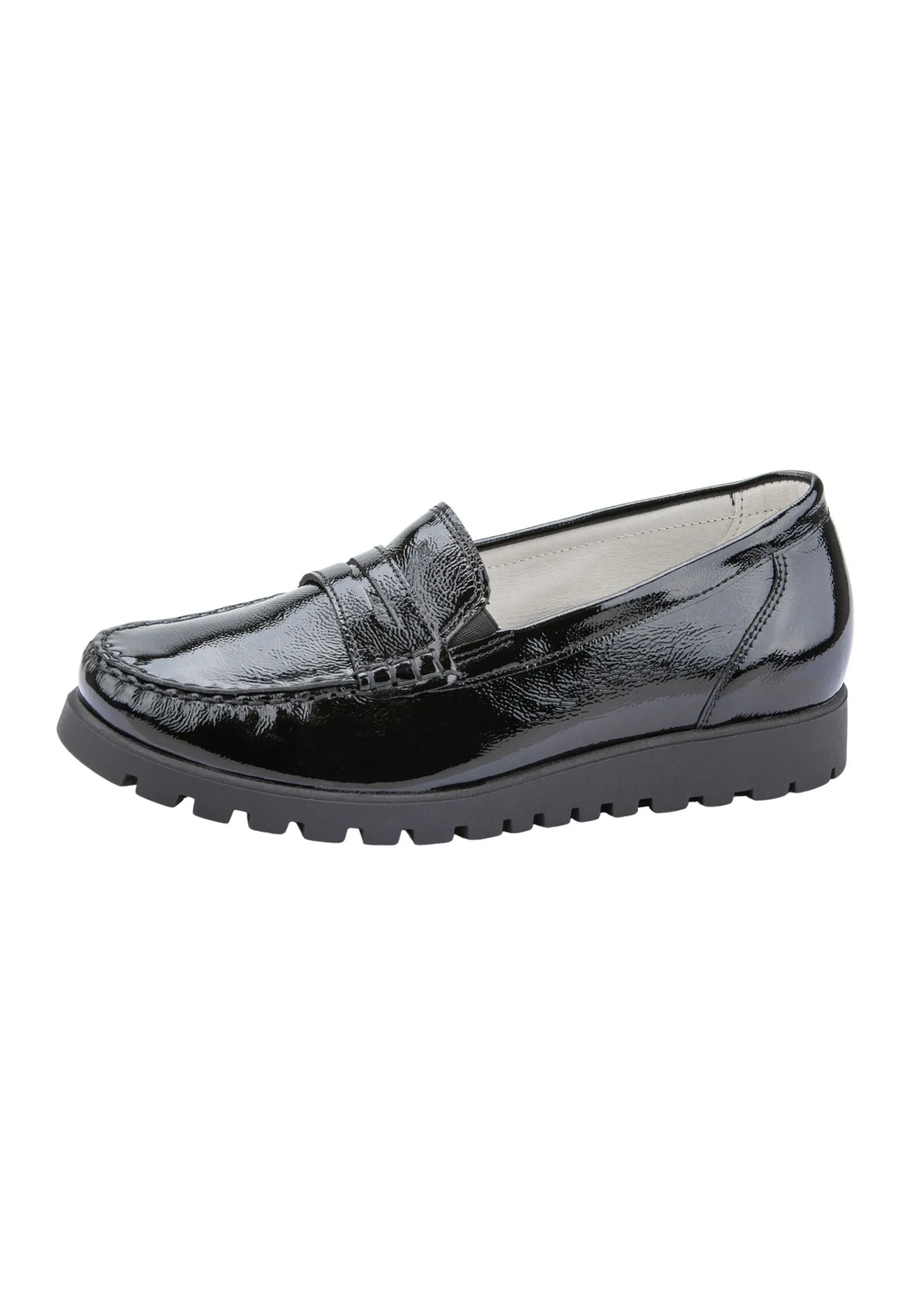 Ein Muss Für Modebewusste: Der Damen-Mokassin Hegli In Schwarzem Nappa-Knautschlack. Die Rubflex Sohle Sorgt Für Einen Sicheren Tritt, Die Bequemweite H Selbst Bei Einem Etwas Stärkeren Fuß Für Optimalen Platz. Typisch Für Einen Echten Mokassin Ist Die Charakteristische Handnaht, Typisch Für Eine Waldläufer Das Luftgepolsterte Wechselfußbett.