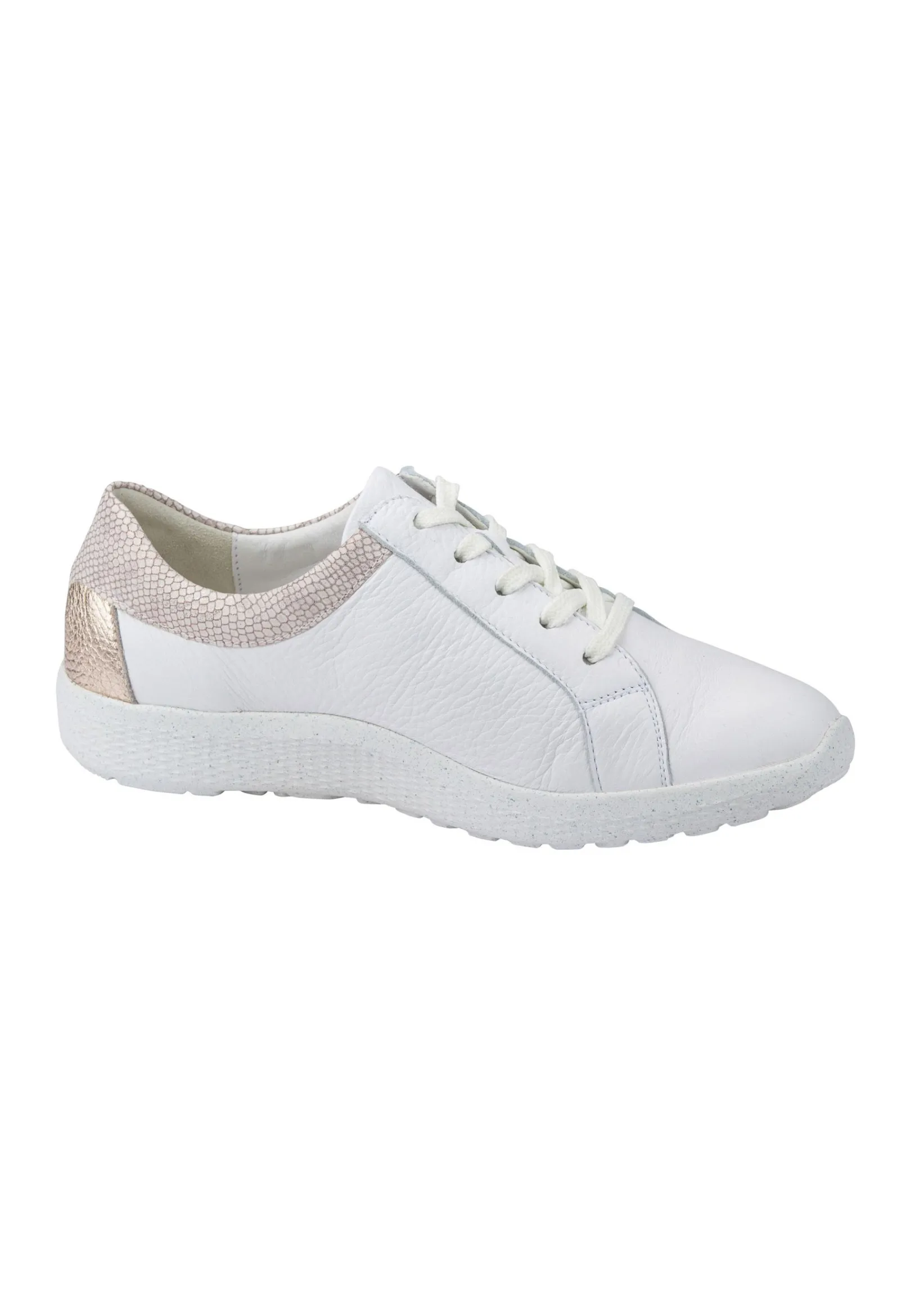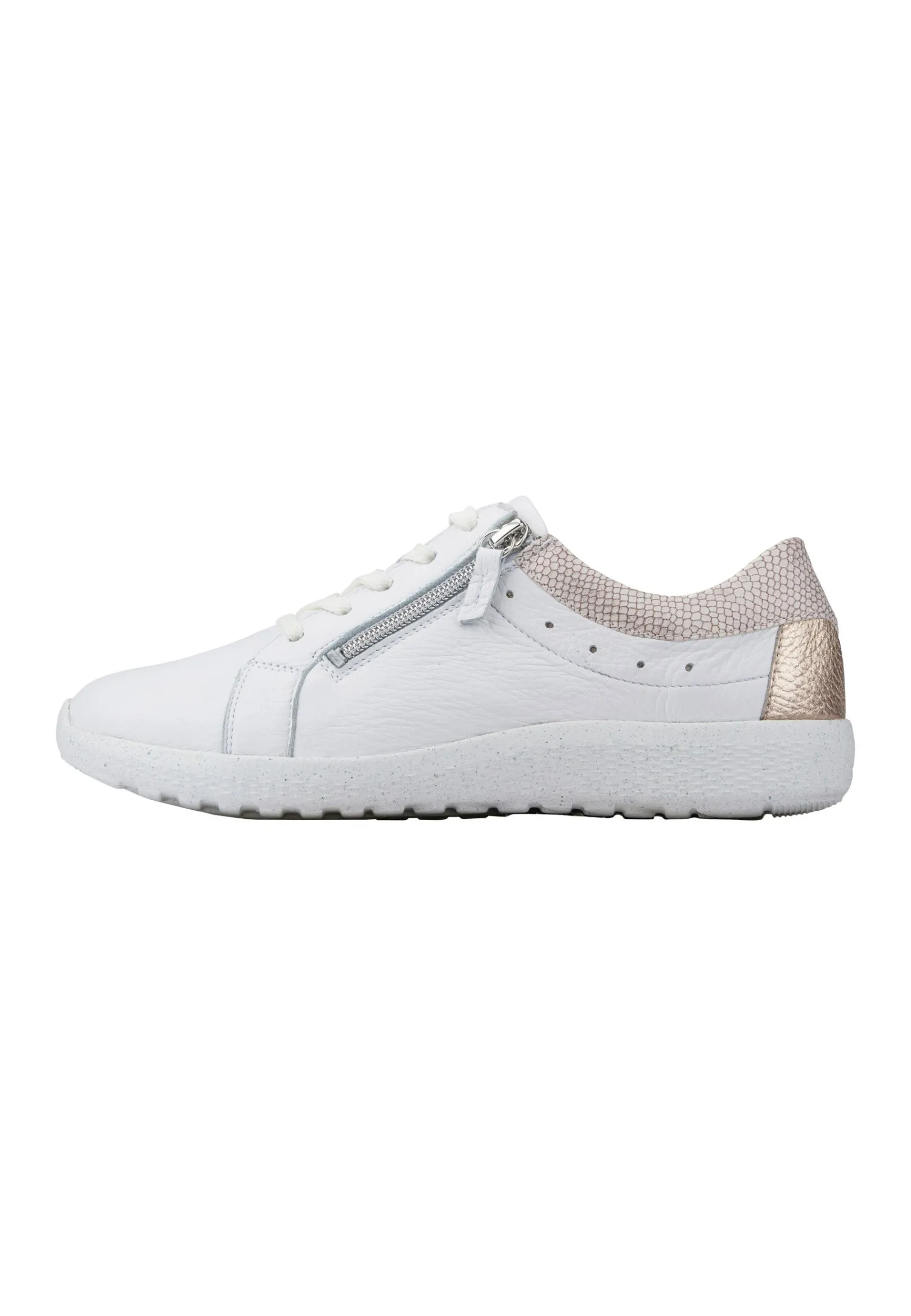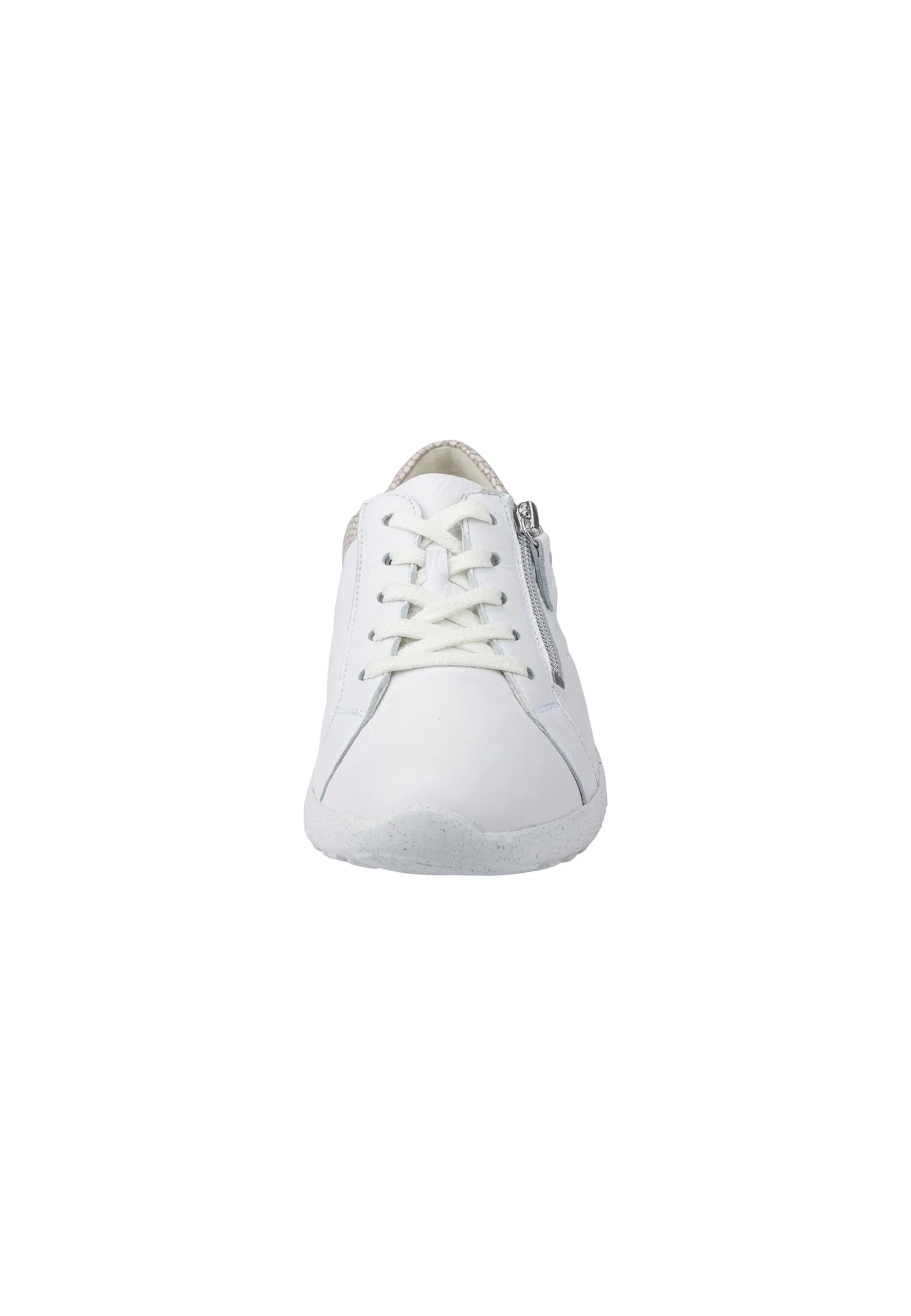 Der Damen-Schnürschuh K-Ira In Der Farbe Weiß Setzt Mit Seinem Echten Hirschleder In Hochwertiger Verarbeitung Auf Besondere Bequemlichkeit Und Optimale Passform: Angefangen Bei Der Spezialweite K Für Den Kräftigen Fuß Über Den Praktischen Reißverschluss An Der Seite Fürs Leichte An- Und Ausziehen. Nachhaltig Ist Er Auch Noch, Denn Die Laufsohle Kann Zu 60-70% Recycled Werden.