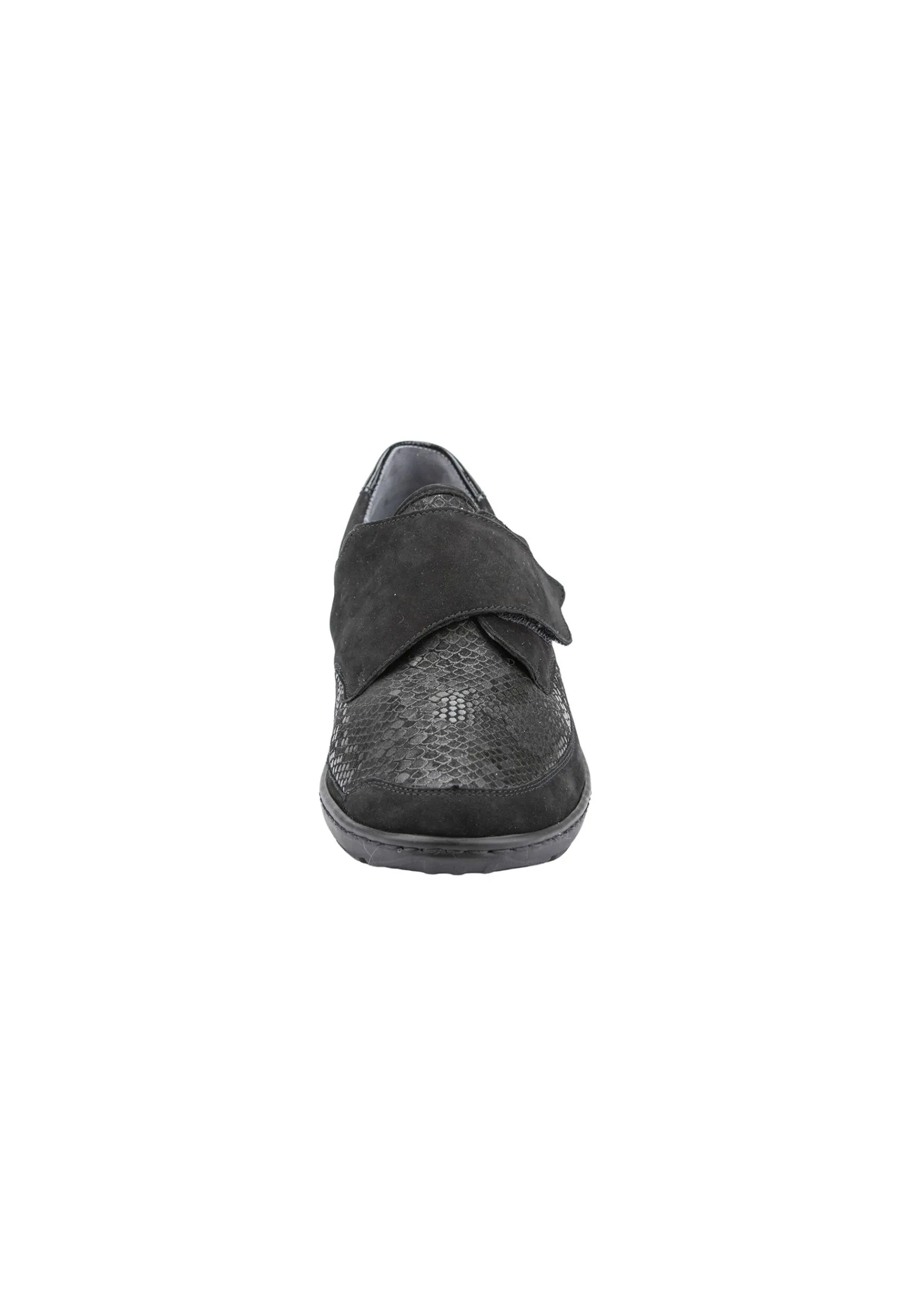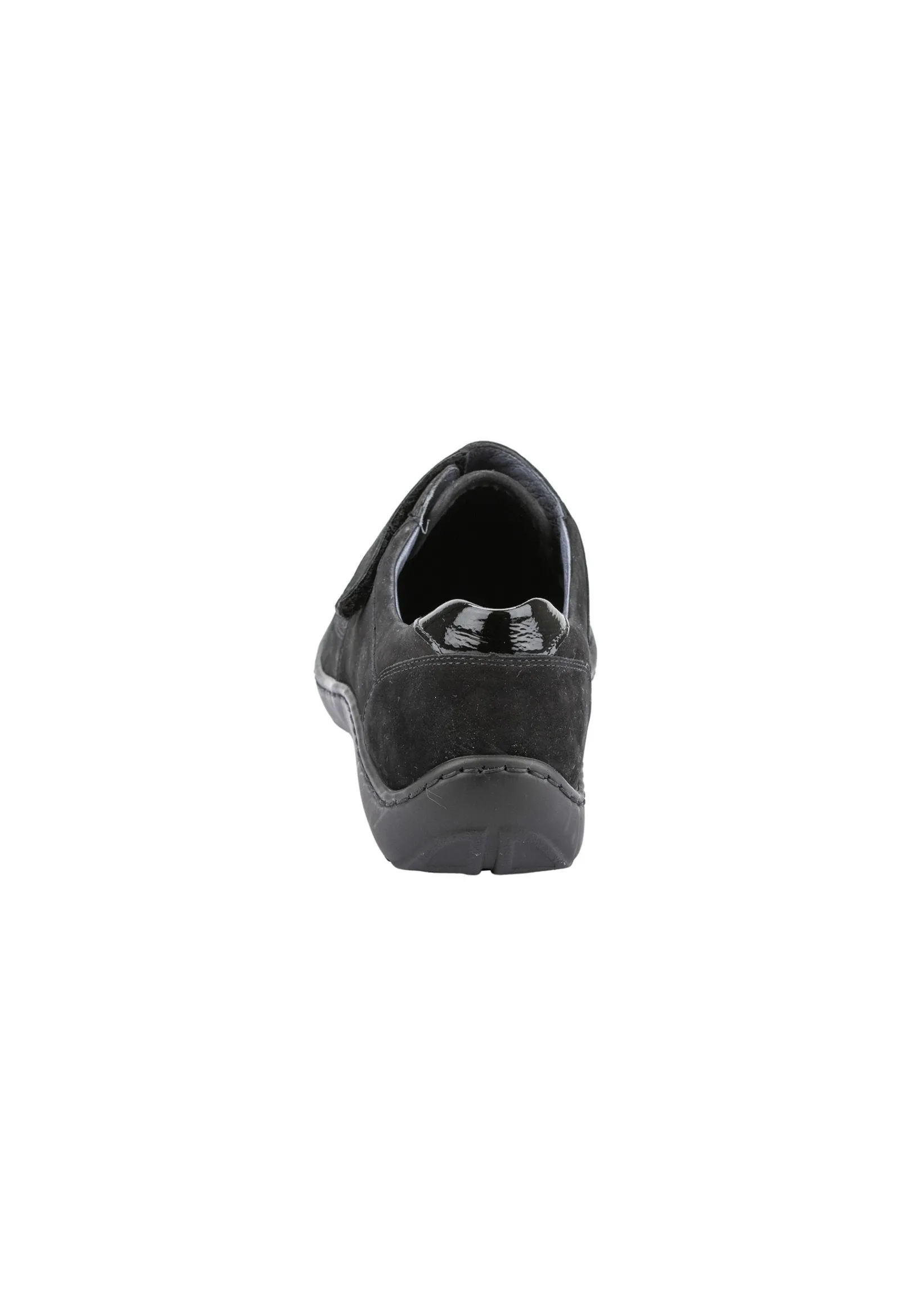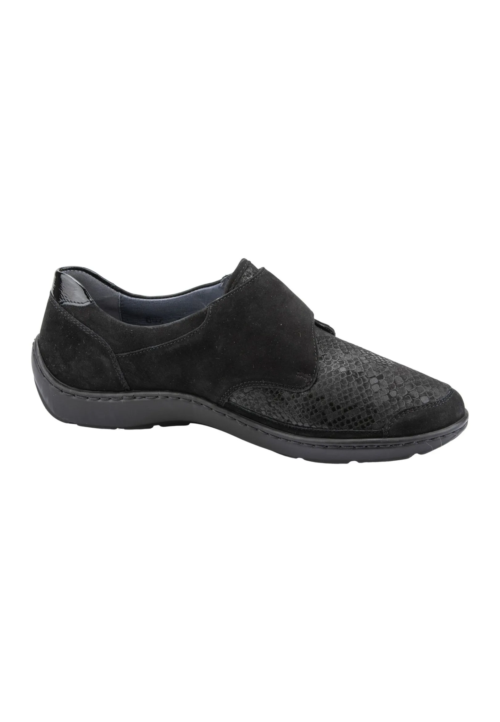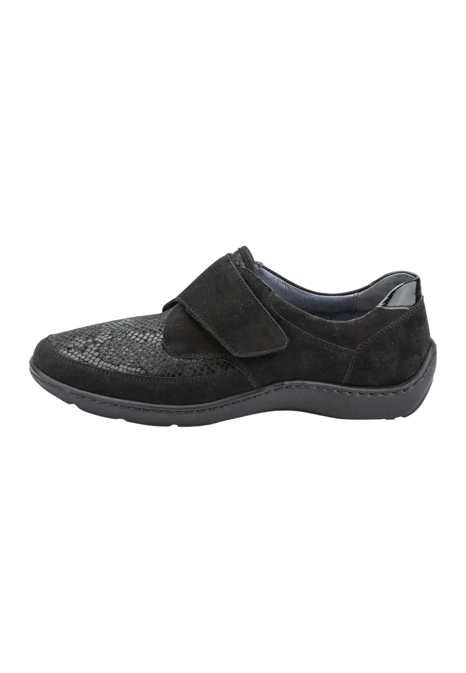 Der Henni-Soft Halbschuh Von Waldläufer Ist Ein Zeitloser Klassiker Für Stilbewusste Damen, Die Komfort Schätzen. Mit Seinem Obermaterial Aus Hochwertigem Lackleder, Nubukleder Und Textil Strahlt Er Eine Edle Eleganz In Elegantem Schwarz Aus. Dank Des Praktischen Klettverschlusses Lässt Sich Der Schuh Individuell Anpassen. Die Großzügige Komfortweite H Gewährleistet Eine Bequeme Passform. Das Innenfutter Aus Echtem Leder Sorgt Für Ein Angenehmes Tragegefühl. Die Pu-Sohle Bietet Eine Gute Dämpfung Und Einen Sicheren Auftritt. Der Henni-Soft Halbschuh Ist Die Perfekte Wahl Für Damen, Die Zeitlosem Design Und Erstklassiger Qualität Den Vorzug Geben.
